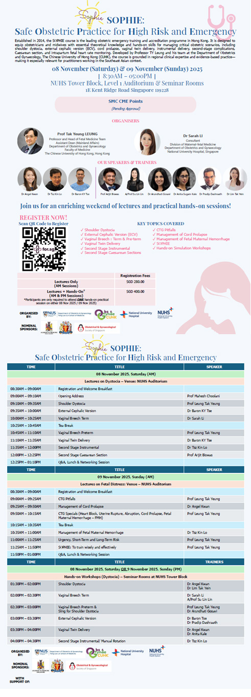 08 November 2025 to 09 November 2025 For any inquiries & registration please contact: Secretariat : The Chinese University of Hong Kong Tel : (852) 3505 1534 Fax: (852) 2636 0008 Email : cuogevents@cuhk.edu.hk Registration Link : SOPHIE 2025: Safe Obstetric Practice for High Risk and Emergency | FormSG Website : O&G CUHK – Department of Obstetrics and Gynaecology, The Chinese University of Hong Kong |