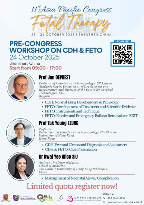 24 October 2025 For any inquiries & registration please contact: Secretariat : Pre-Congress Workshop on CDH & FETO Tel : (852) 3505 2580 Fax : (852) 2636 0008 Email : cuogevents@cuhk.edu.hk Website : 1st Asia Pacific Congress in Perinatal Medicine – O&G CUHK Registration Link : APCFT 2025 - Registration |